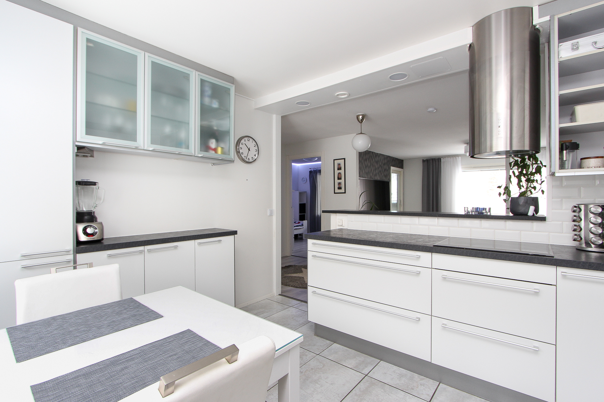 - Kaapistot, jääkaappi, induktioliesi, kiertoilmauuni, liesituuletin (hormiin), astianpesukone, mikroaaltouuni, komposiittiallas. Seinät maalattu, lattia laattaa, lattialämmitys.