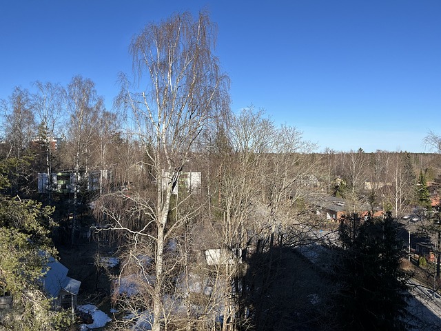 - Avarat kuudennen kerroksen näkyvät, pihapiiri, puita.