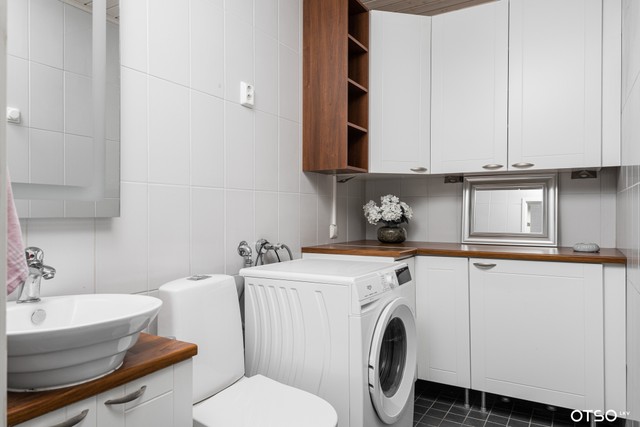 - Lattia: laminaatti Seinät: kaakeli Erillisen wc:n yhteydessä kodinhoitotila, pesukoneliitäntä
