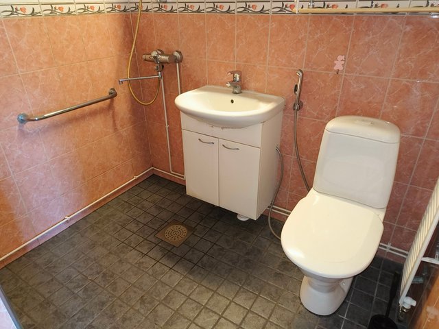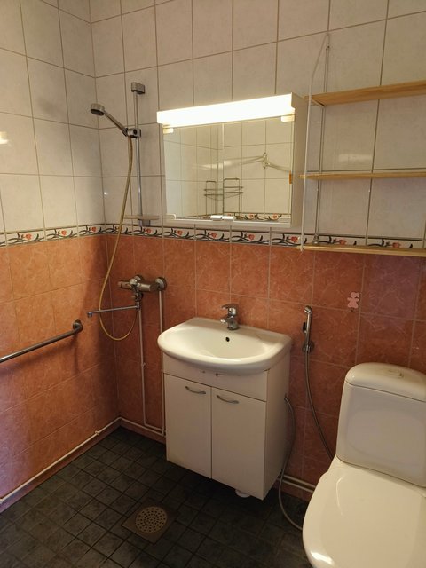 - -Suihku, wc-istuin, käsienpesuallas, pk-liitäntä -Seinät ja lattia laatoitettu