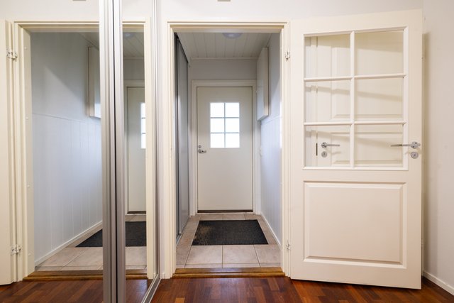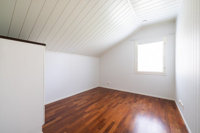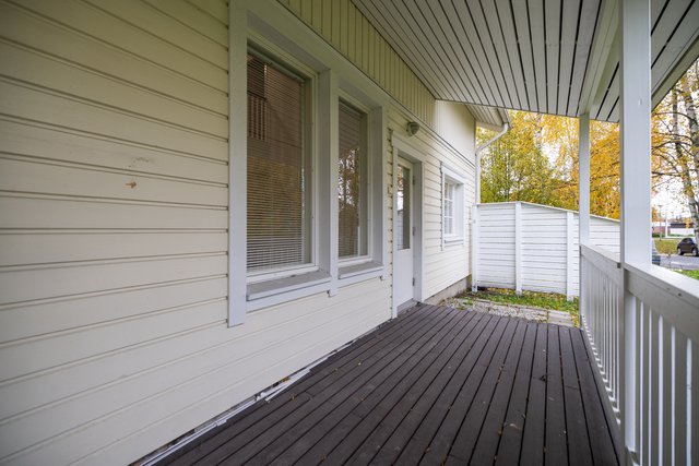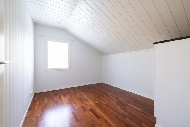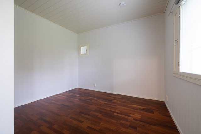 - Asuinhuoneiden seinät pääosin valkoiseksi maalattua tapettia, kosteat tilat laatoitettu ja sauna puupaneloitu.