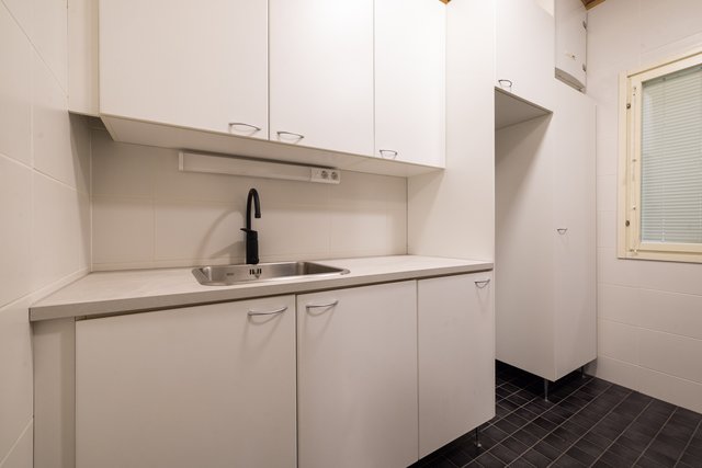 - Pesuhuoneen yhteydessä kodinhoitotilaa. Kodinhoitotilassa kaapistoja.