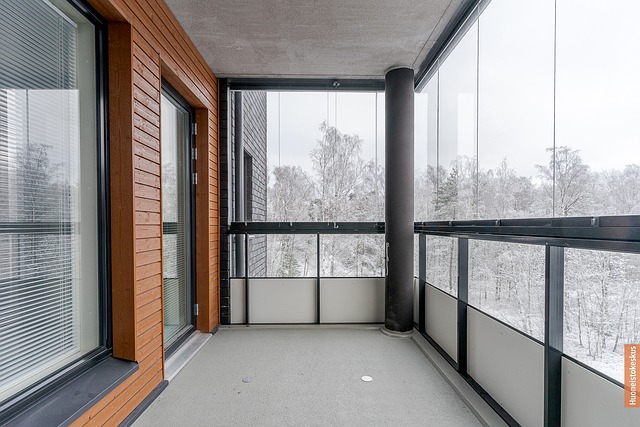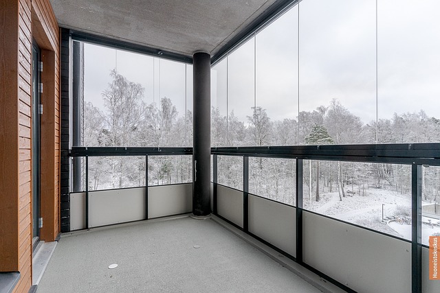 - vehreä, puustoinen näkymä yhtiön sisäpihalle tilavalta lasitetulta parvekkeelta