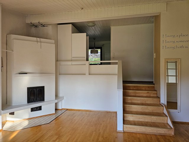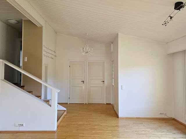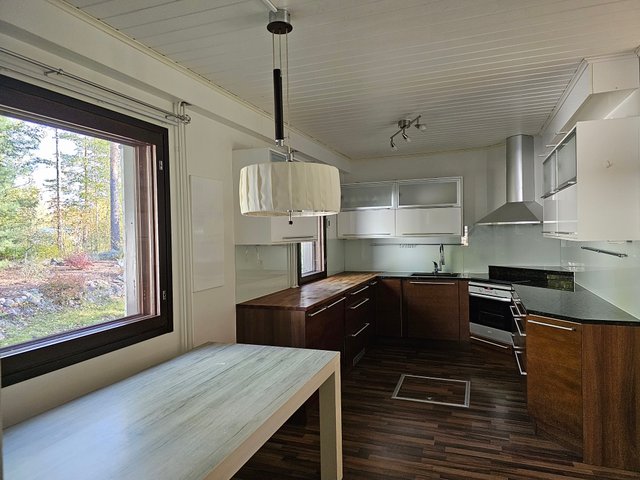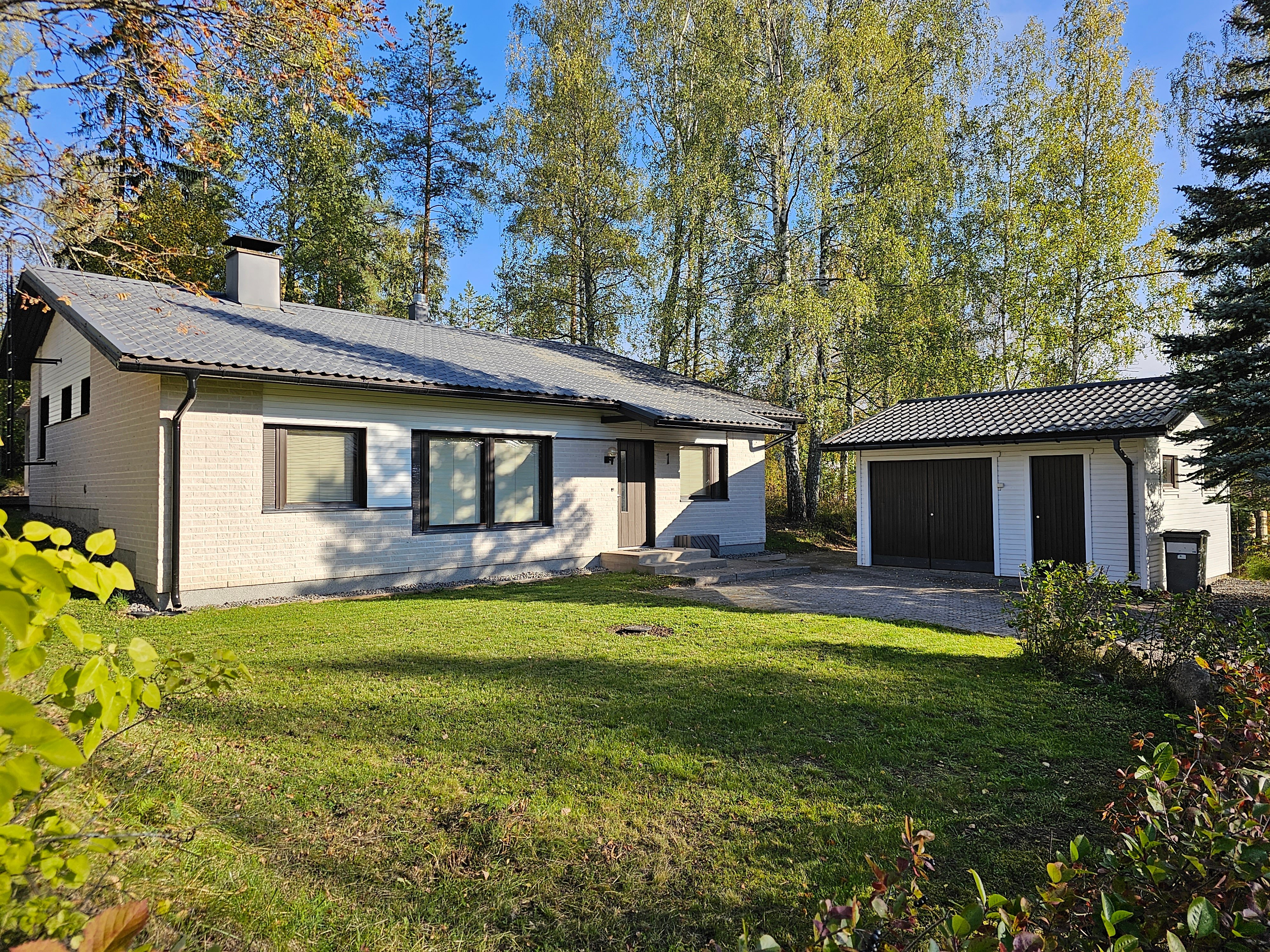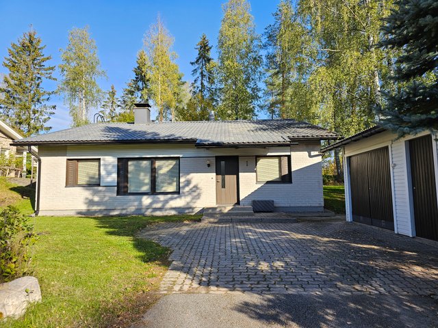 Olohuoneessa on avara kattokorkeus ja varaava takka. Ruokailutilasta avautuu maisema läpitalon ja keittiö on remontoitu v.2008. Keittiössä on kestävät kivitasot ja tyylikkäät kaapistot tunnelmavaloin. Kolme makuuhuonetta, hyvin säilytystilaa ja erillinen vaatehuone. Kodinhoitohuoneesta on käynti suoraan pihalle. Saunassa saat nauttia puukiukaan löylyistä. Takapiha on suojaisa ja katettu terassi on viihtyisä.