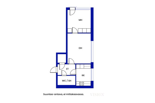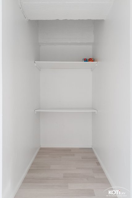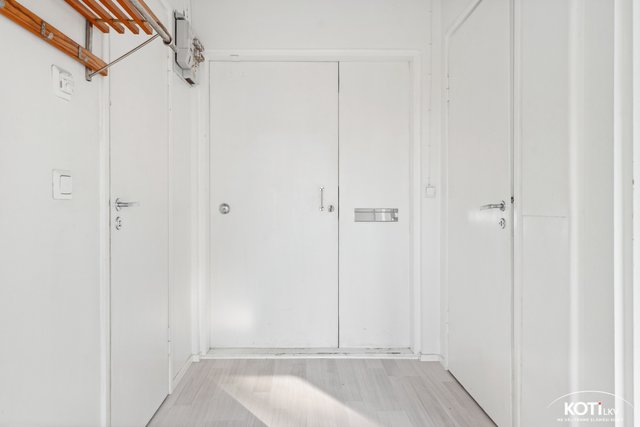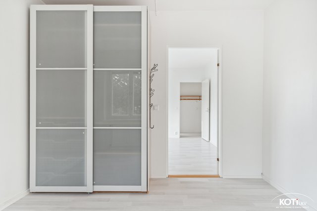 Keittiö on kompakti ja varustettu nykyaikaisilla laitteilla. Tilava vaatehuone tarjoaa runsaasti säilytystilaa.
