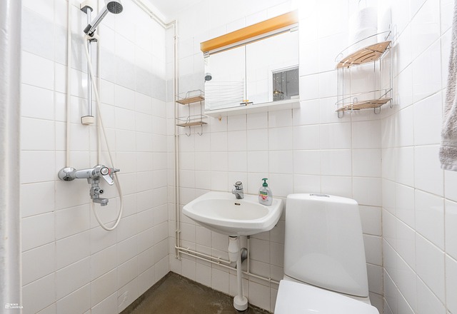 - Suihku, käsienpesuallas, peilikaappi, wc-istuin. Lattia betonia, seinät osittain laatoitettu ja maalattu.