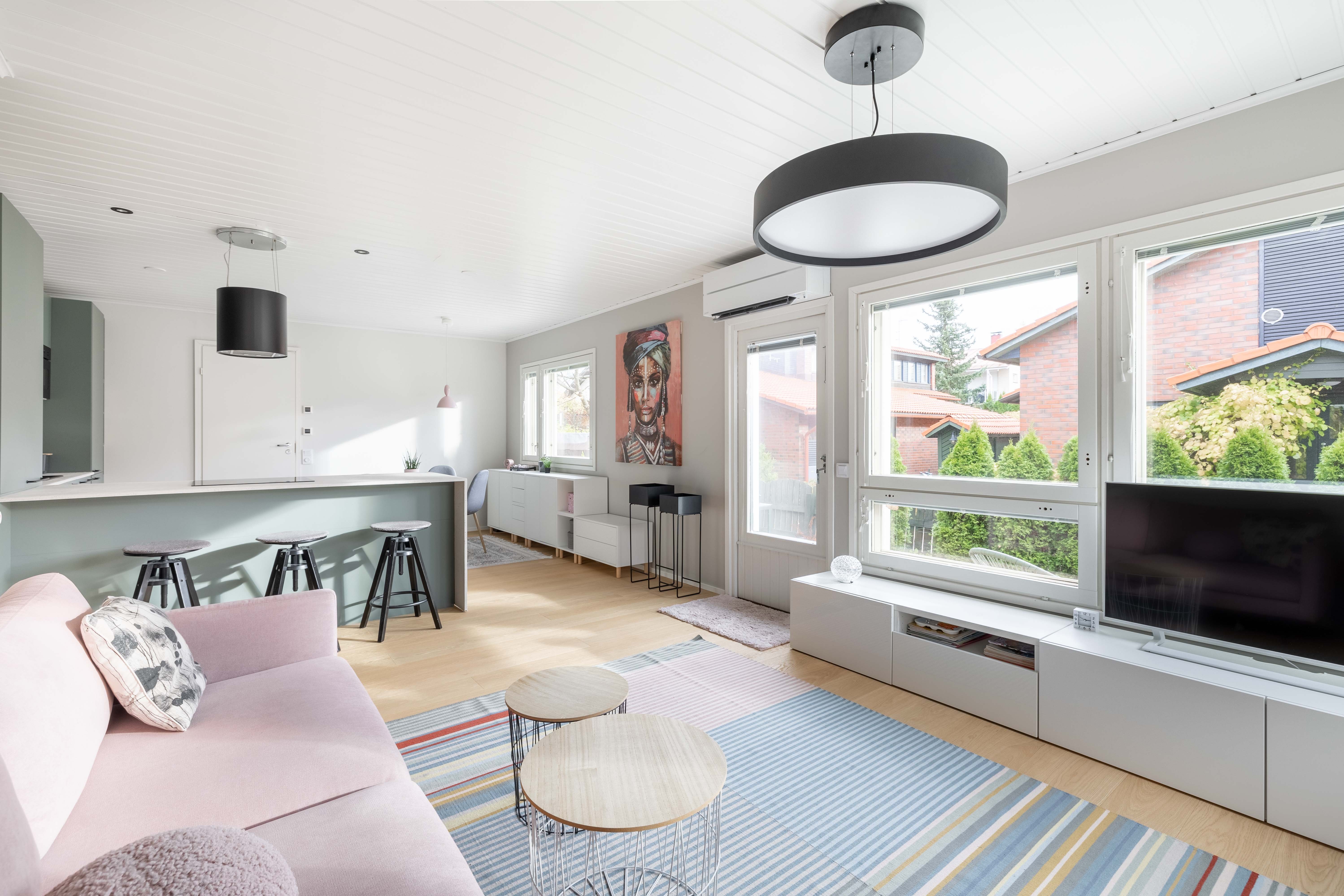 Kodin valoisa olohuone, moderni avokeittiö ja ruokailutila muodostavat kodikkaan ja toimivan kokonaisuuden, josta on kulku suojaisalle piha-alueelle.