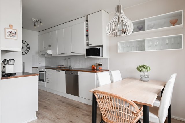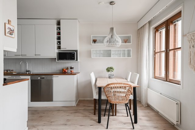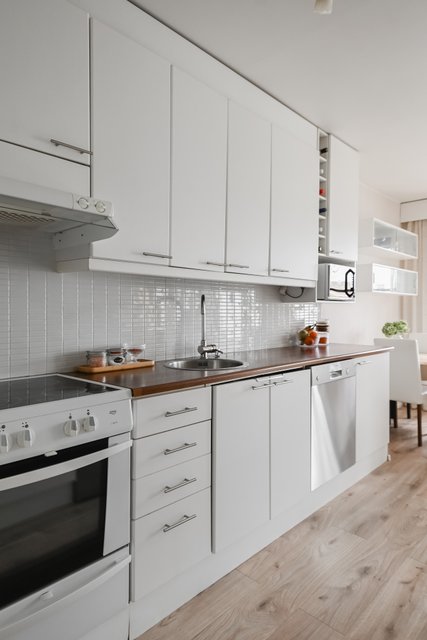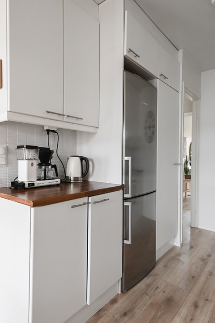 - Jääkaappipakastin, liesi, liesituuletin, ja astianpesukone