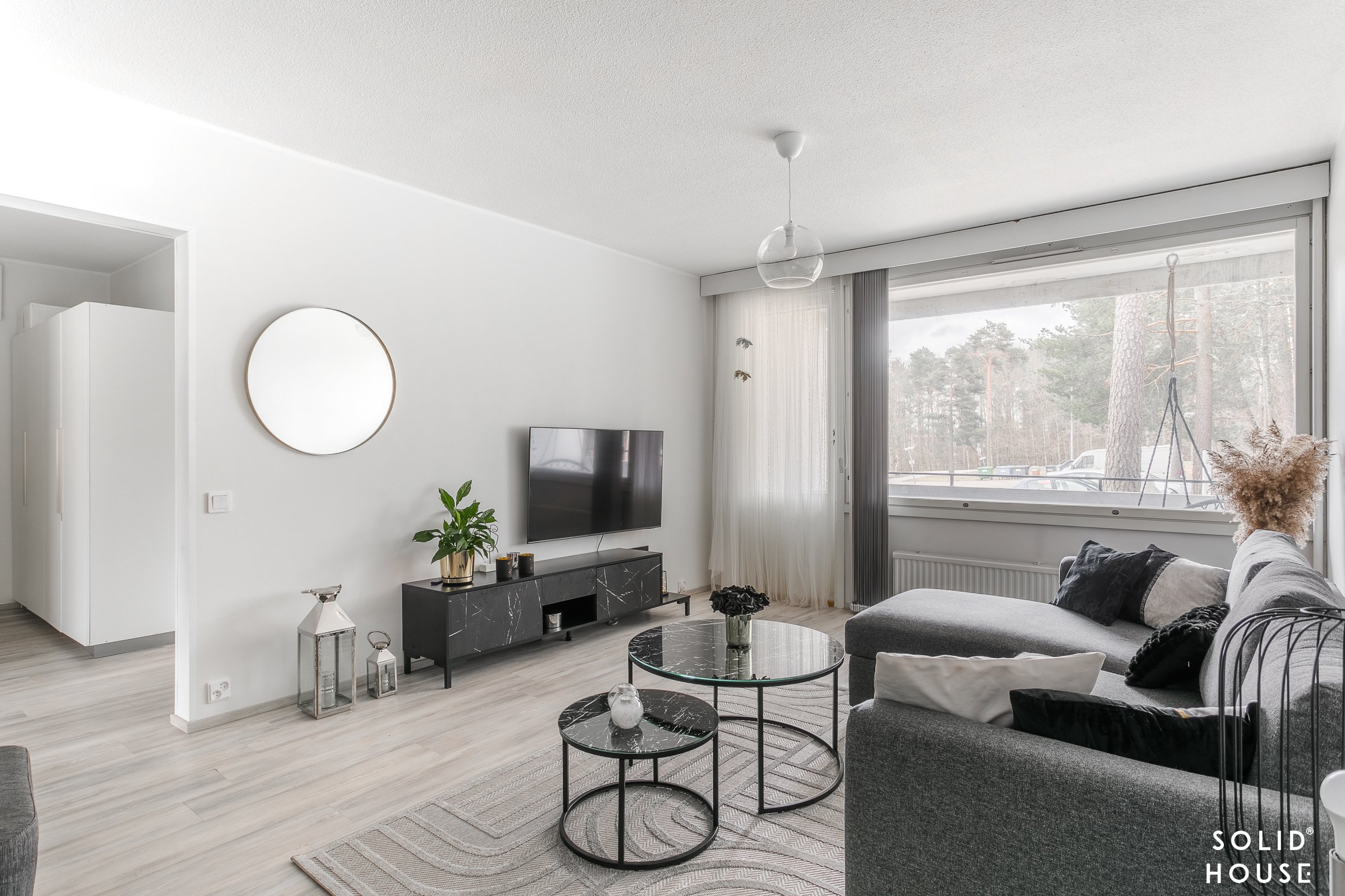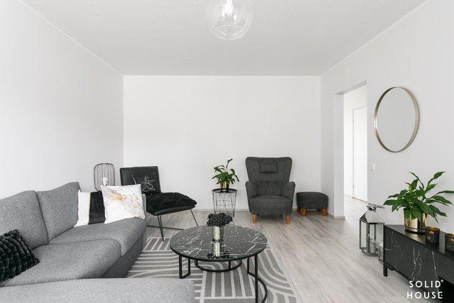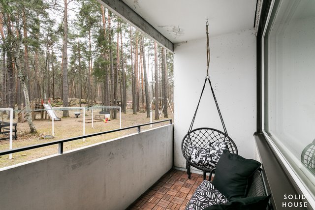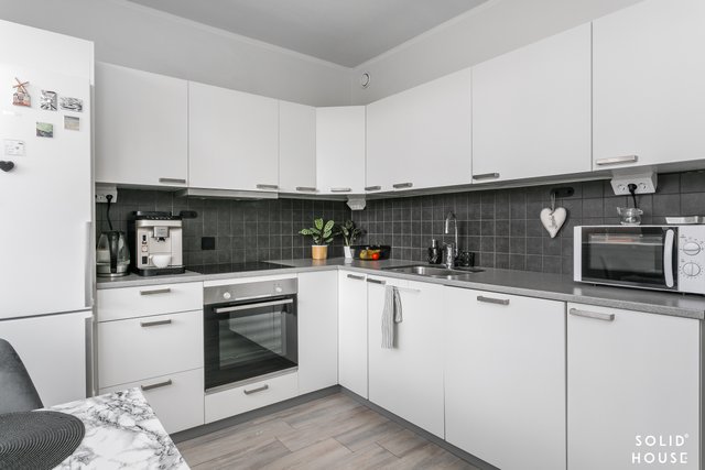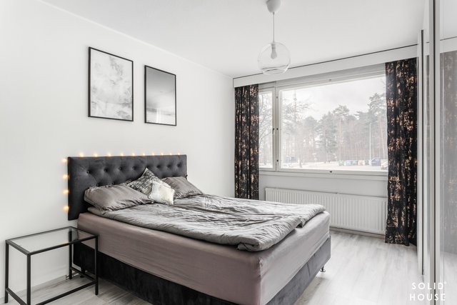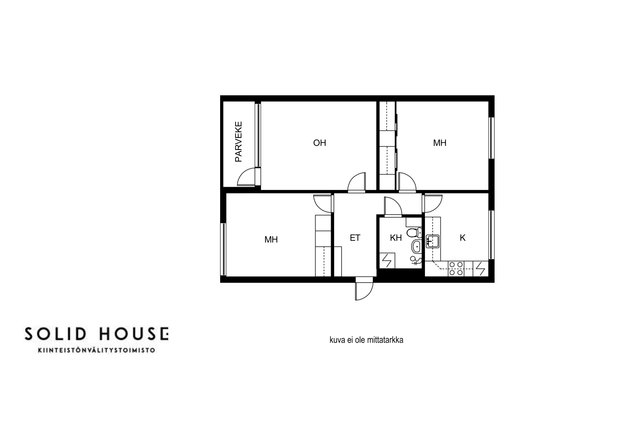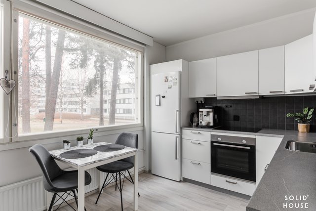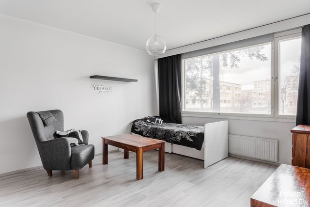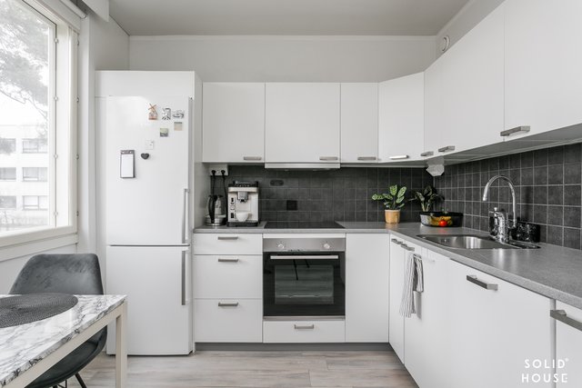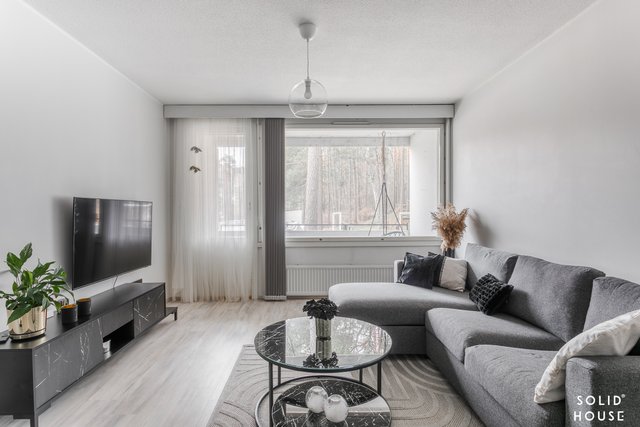 Viihtyisä läpitalon kolmio, jossa isot ikkunat antavat valon tulla asuntoon. Tässä asunnossa neliöt on hyödynnetty hyvin eikä hukkaneliöitä ole. Tilava olohuone, josta käynti parvekkeelle. Keittiössä paljon kaappi- ja laskutilaa sekä toimivat kodinkoneet. Ruokapöydällekin on tilaa.
