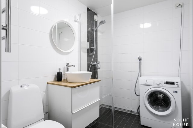 - Seinät ja lattia laatoitettu, wc-istuin, pesuallas, allaskaappi, suihku, suihkuseinä, peili. Lattia laattaa, seinät laattaa.