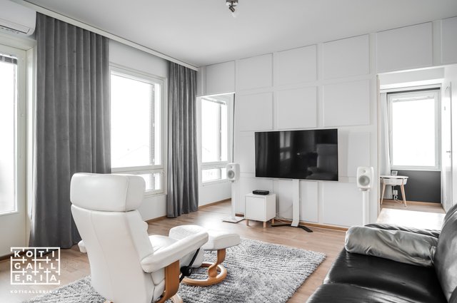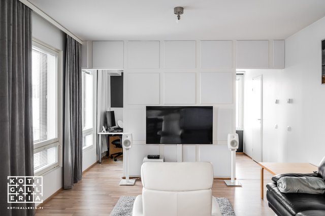 - Olohuoneen seinässä olevat akustiikkalevyt.