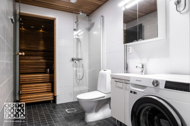 - WC-istuin, suihku, suihkuseinä, pesukoneliitäntä, lattialämmitys, peilikaappi, pesuallas, allaskaappi, ja bidee-suihku