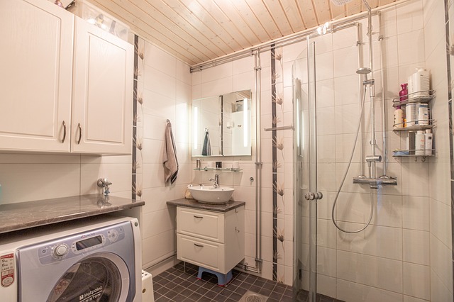 - Suihkuseinä, pesukoneliitäntä, suihku, allaskaappi, ja peili