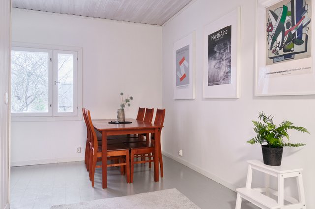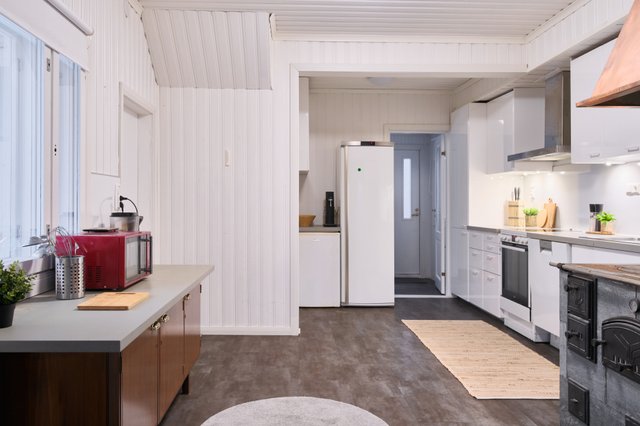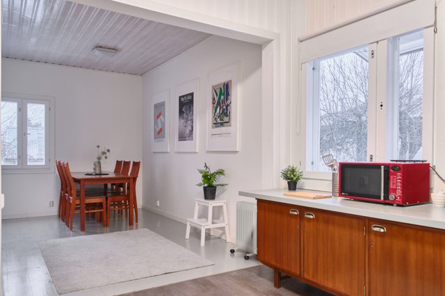 - Kauniisti remontoitu valkoinen keittiö, jossa on kaikki nykyajan mukavuudet. Ikkunan ääressä lisää pöytätasoa ja kaappitilaa. Lisäksi puuliesi, jonka yllä kaunis kuparinen huuva. Keittiöön on kulku pääsisäänkäynnin yhteydessä olevalta kuistilta sekä toinen sisäänkäynti pihan puolelta pienen kuistin kautta. Lisäksi keittiöstä käynti kellaritilaan, jossa on puuvarasto. Keittiö yhdistyy kauniisti erilliseen ruokahuoneeseen, johon mahtuu isompikin ruokapöytä ikkunan ääreen.