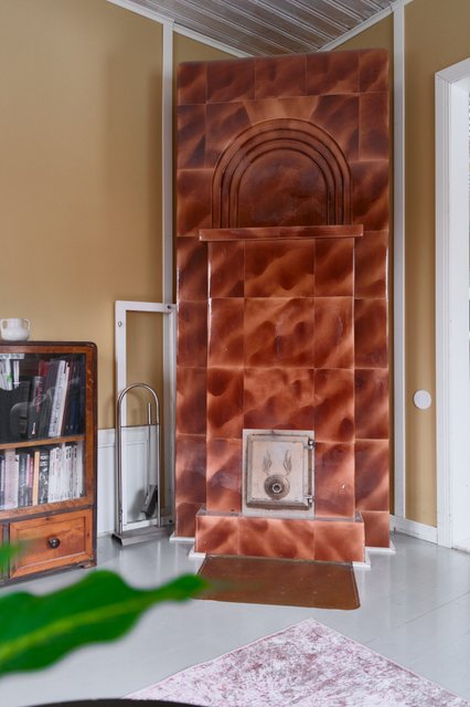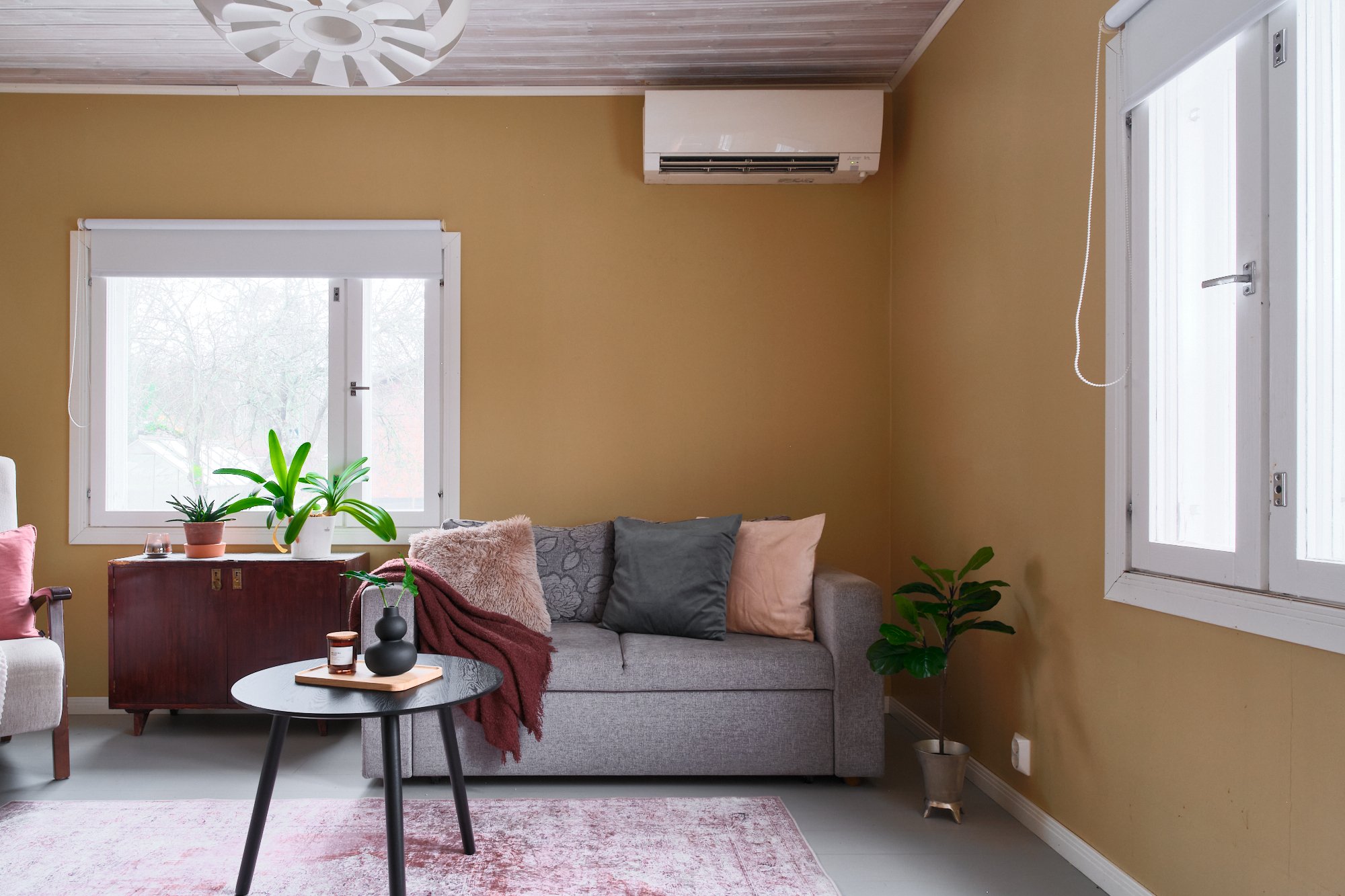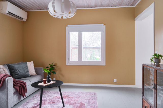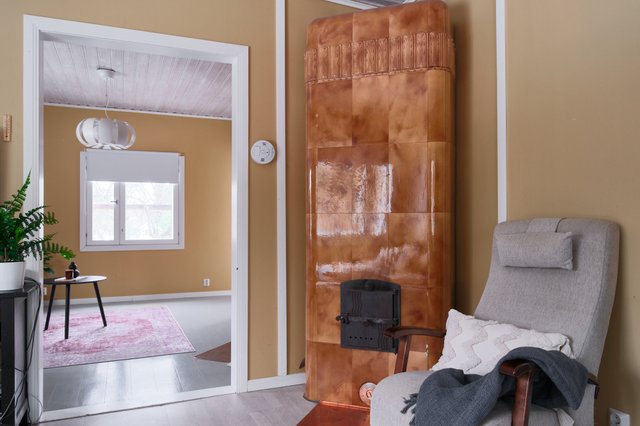 - Olohuoneen tunnelman luojana ja lämmön lähteenä toimii kaunis varaava takka. Ilmalämpöpumppu tuo tarvittaessa lisälämpöä ja kesällä viileyttä.