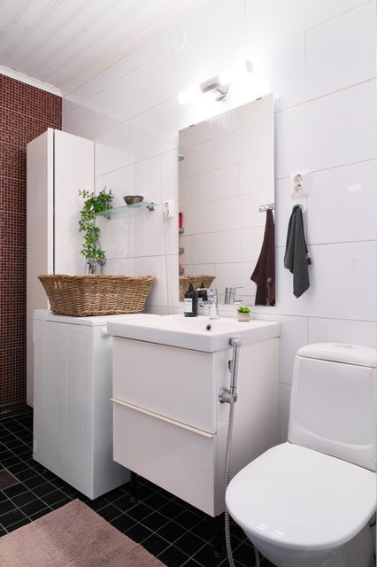 - WC-istuin, suihku, pesukoneliitäntä, peili, allaskaappi, pesuallas, bidee-suihku, ja lattialämmitys