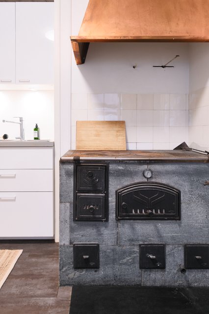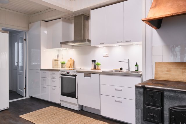 - Jääkaappipakastin, liesi, liesituuletin, astianpesukone, ja puuliesi
