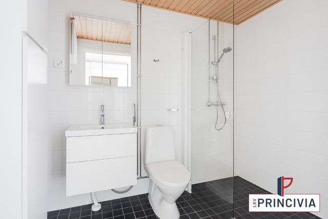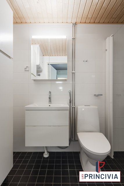 - Kaunis ja tilava pesuhuone/ wc, jossa tila pesutornille. Wc-istuin Ido Seven D soft close -istuinkannella. Allashana ja suihkusekoittaja Hansgrohe. Katto tervaleppäpaneelia pyöreällä reunaprofiililla.