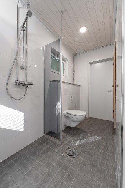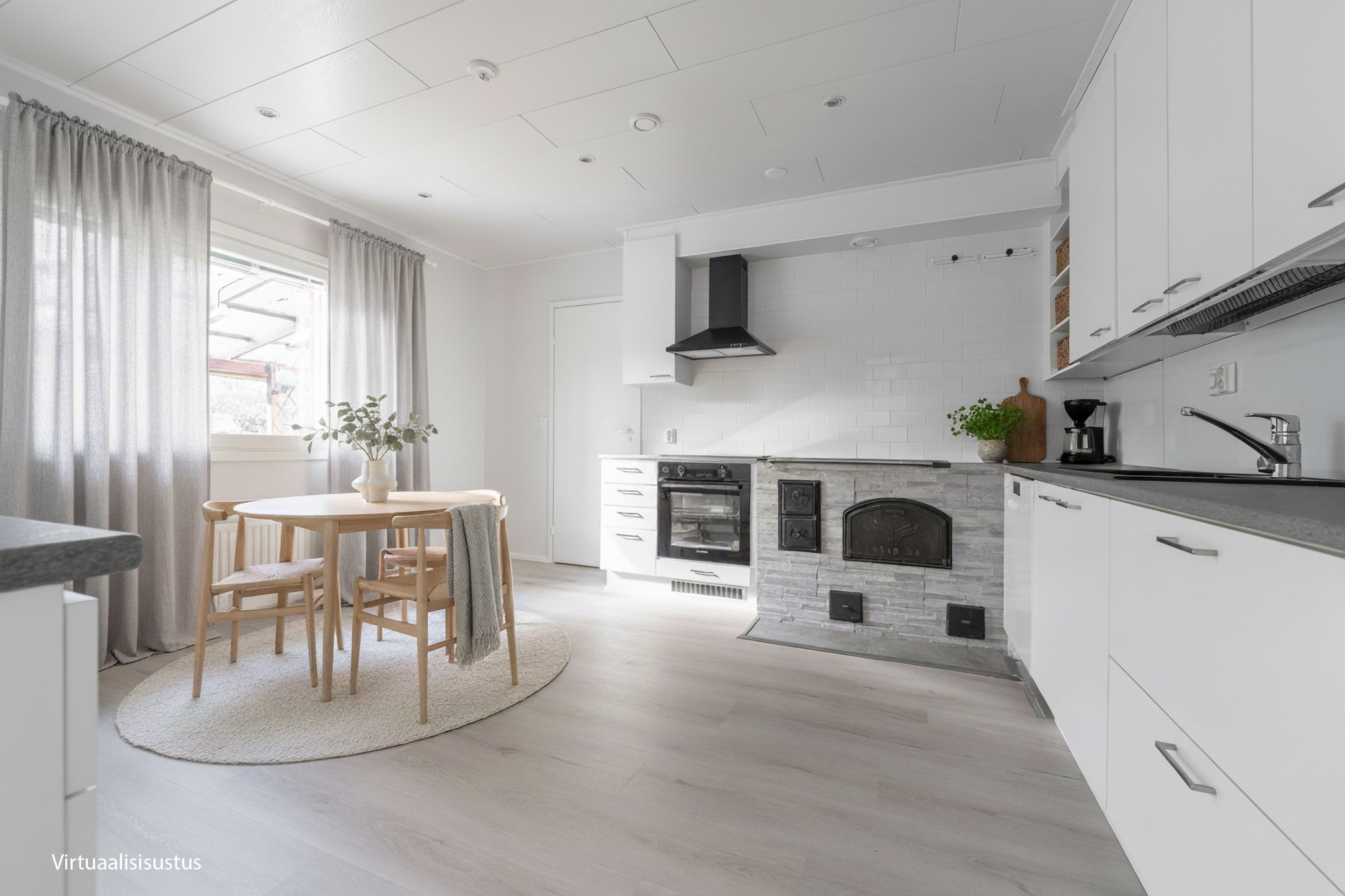 Sisäänkäynti taloon on muutaman porrasnousun päässä suojaisalta sisäpihalta. Pihan viihtyvyyttä lisää katettu terassi. Sisätiloista löytyy kodin sydän: tilava KEITTIÖ, jonne on ihana kokoontua koko perheen voimin nauttimaan yhteisistä hetkistä. Maalaishenkeä tuo vanha puuhella, joskin sen toimivuudesta ei ole tietoa nykyisellä omistajalla eli sen osalta selvittely jää ostajalle. Valoisan olohuoneen jatkeena on kirjastohuone/makuuhuone, josta pääset kätevästi myös pesutiloihin. Saunasta löytyy puukiuas ja pesuhuoneen yhteydessä on kodinhoitotila pesualtaineen ja kaappeineen. Näistä tiloista on käynti ulos. Tämä onkin myös ihanteellinen ratkaisu koiran omaavalle, silloin kun koiran tassut vaativat pesua kuntopolulla tehdyn lenkin jälkeen.