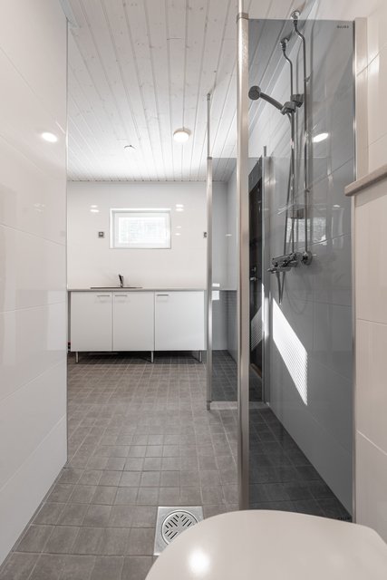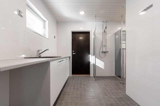 - Pyykkikaapit, pöytätaso, pesukoneliitäntä, ja pesuallas