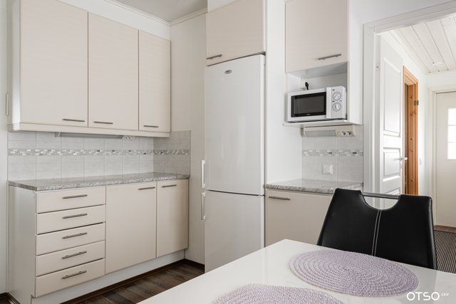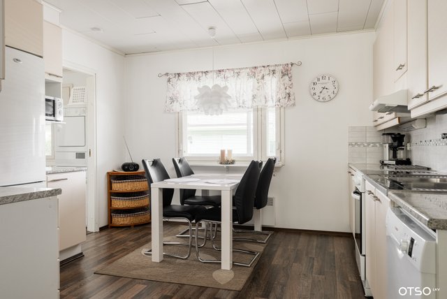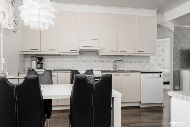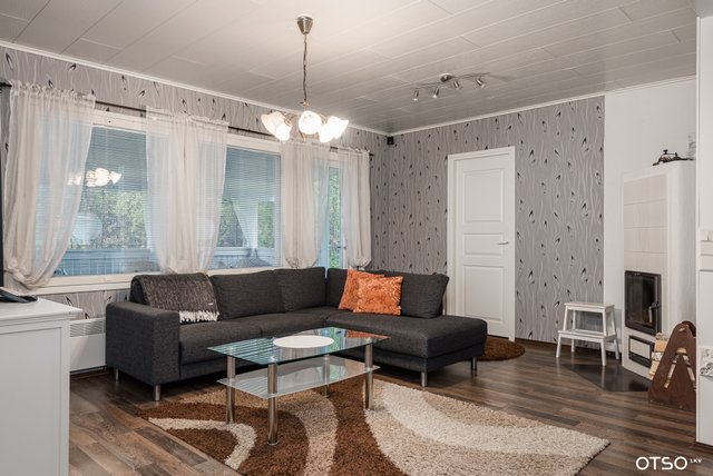 Tilava olohuone, jossa kaunis varaava takka luo lämpöä. Vaaleasävyisessä keittiössä hyvin kaappeja ja ikkunan edessä onkin pöydälle juuri sopiva paikka.
