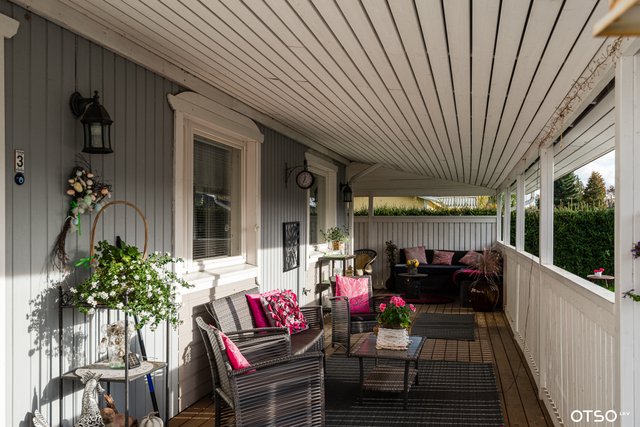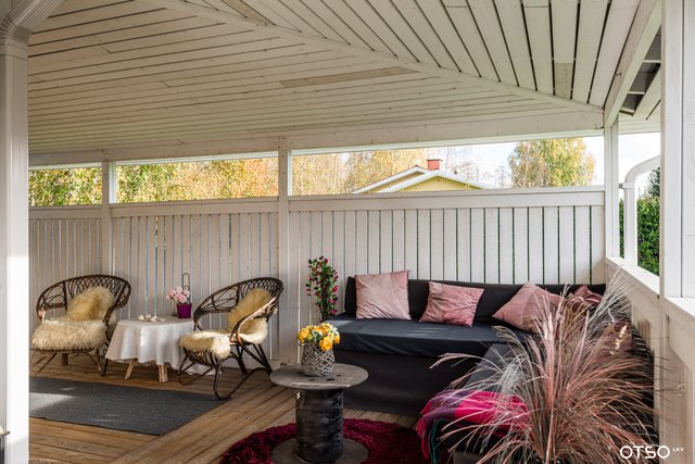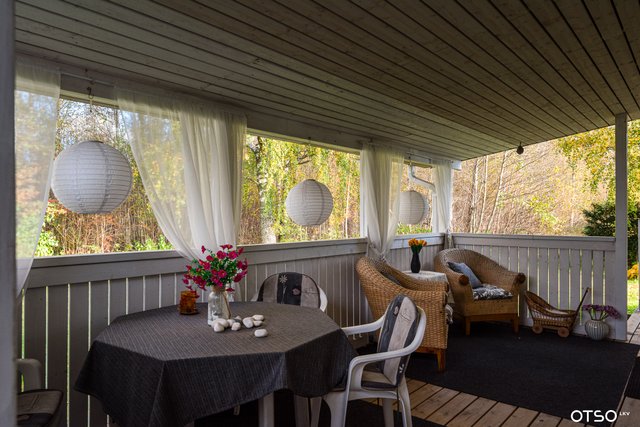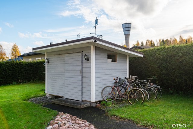 Talon yhteydessä on lämmin autotalli ja varasto, ja lisäksi pihalla on erillinen pihavaja. Tilavat katetut terassit molemmin puolin taloa tarjoavat loistavat puitteet ulkoilmaelämään ja kesäiltojen viettoon.