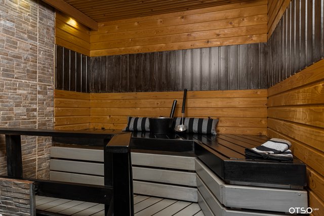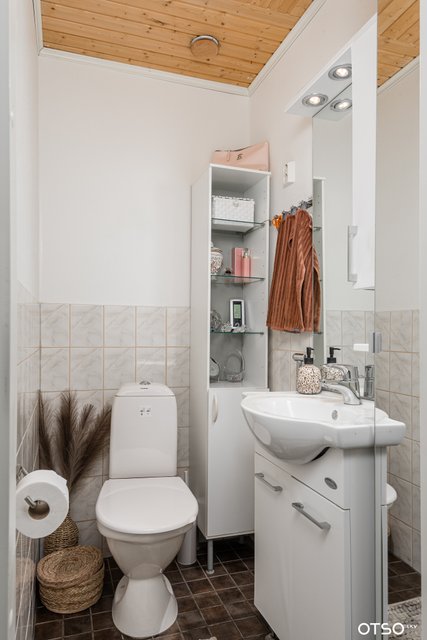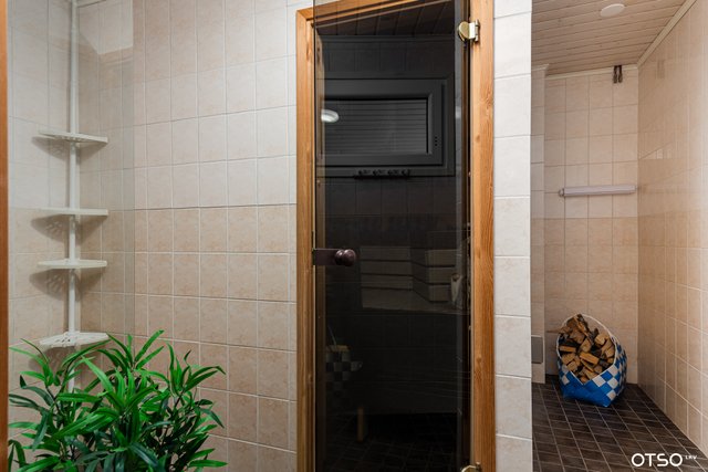 Säilytystilaa piisaa mukavasti. Puulämmitteisessä saunassa kelpaa aina löylyistä nauttia. Pesuhuoneen nurkkauksessa on muuten toiselle wc-istuimellekin varaus olemassa.