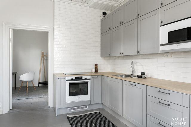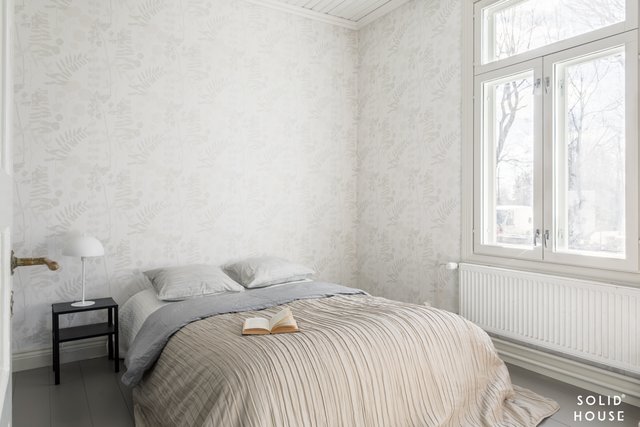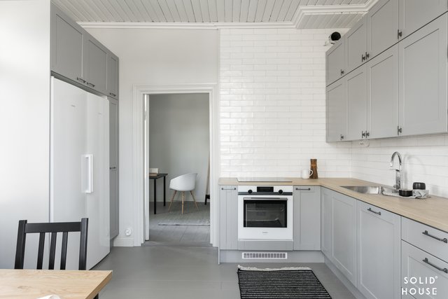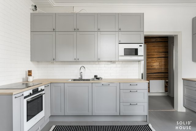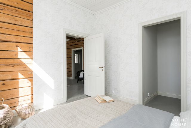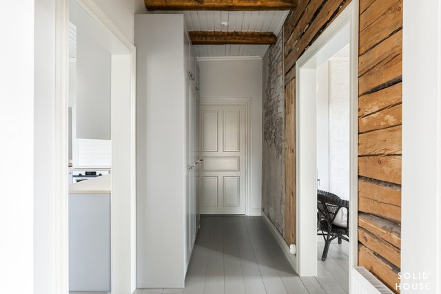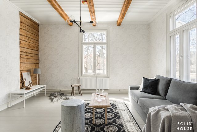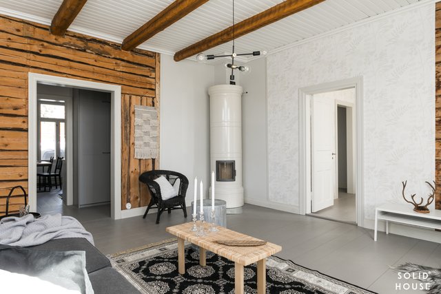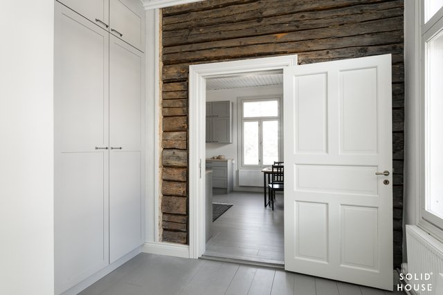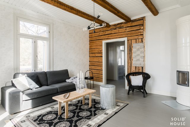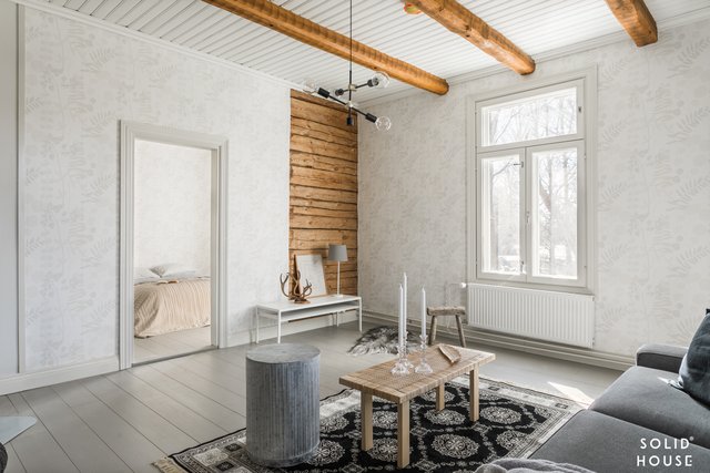Oletko sinä tämän kodin uusi asukas? Tunnelmallisessa olohuoneessa pöhisee uusi pönttöuuni. Keittiössä on varusteena Siemensin helppokäyttöiset nykyaikaiset kodinkoneet ja tyyliin kauniisti istuvat Uniquehomen kaapistot. Kaksi makuuhuonetta sijaitsee erillään toisistaan, varustuksena on komerokaapistoa tai vaatehuone. Asunnossa on yhtenäiset, perinteikkäät ja laadukkaat pintamateriaalit, rakennus on peruskorjattu vanhaa vaalien ja perinnerakentamista kunnioittaen. Osassa huoneissa on nähtävillä vanhaa hirsiseinää, pinkopahvia ja paperitapettia. Vanhoja materiaaleja on säästetty ja uudelleen käytetty niin paljon kuin suinkin on ollut mahdollista. Huoneistossa on oma sauna, kylpyhuoneessa on modernit mukavuudet sadesuihkuineen, ja erillinen wc. Isot kolmeruutuiset ikkunat huolehtivat kodin valoisuudesta.