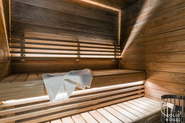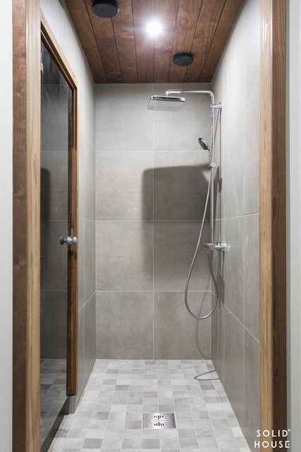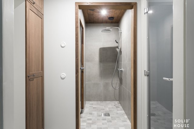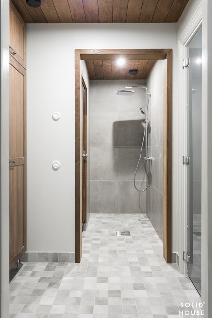 - Varustus: sadesuihku. Seinät kipsilevy/erotettu hirsirungosta koolauksella/-kaakelit. Kipsilevyillä lattiarakenne, jonka päällä kosteussulku ja laatoitus, lattialämmitys: sähköinen