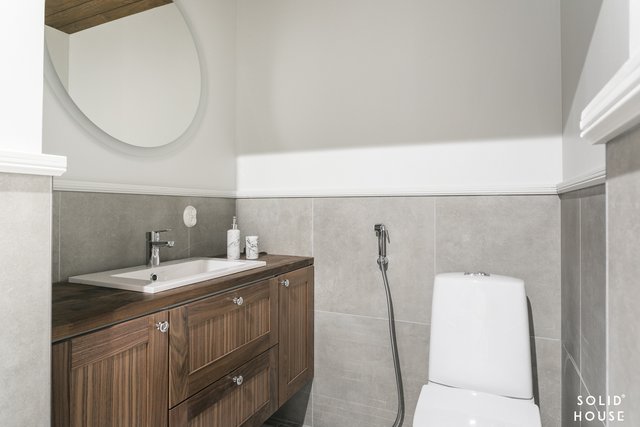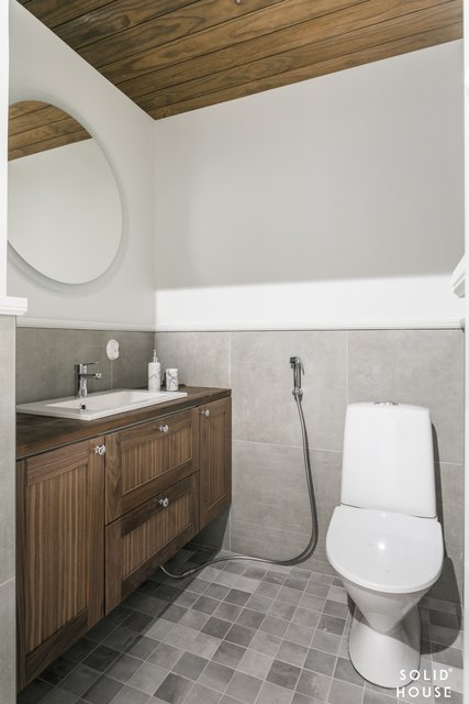- Varustus: kaapistoa, tasoon upotettu allas, hana, seinäpeili valolla, wc-istuin, bide-suihku. Seinät kipsilevy/erotettu hirsirungosta koolauksella/-kaakelit. Kipsilevyillä lattiarakenne, jonka päällä kosteussulku ja laatoitus, lattialämmitys: sähköinen