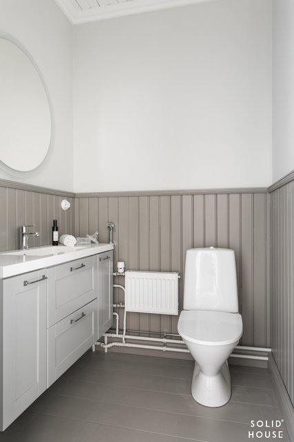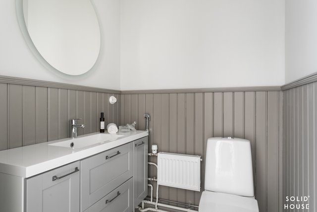 - Varustus: kaapistoa, tasoon upotettu allas, hana, seinäpeili valolla, wc-istuin, bide-suihku. Seinät kipsilevy/erotettu hirsirungosta koolauksella/-kaakelit. Lankkulattia, jossa ei ole lattialämmitystä.