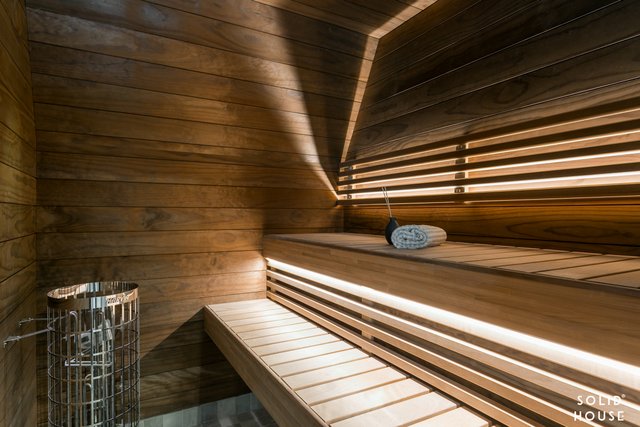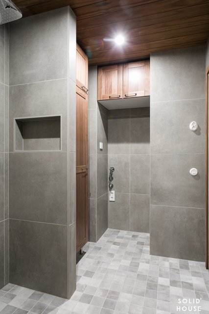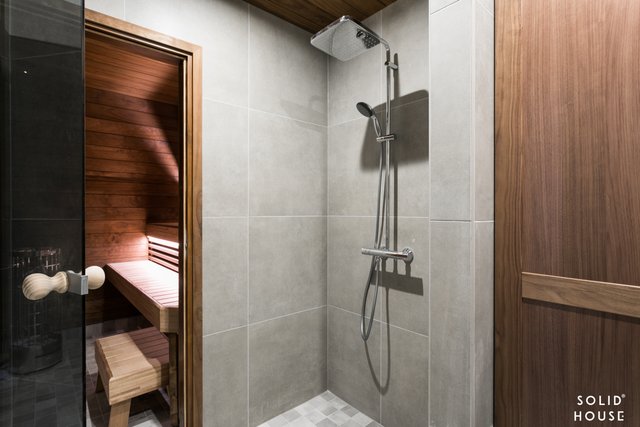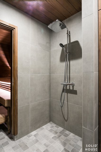 - Varustus: sadesuihku. Seinät kipsilevy/erotettu hirsirungosta koolauksella/-kaakelit. Kipsilevyillä lattiarakenne, jonka päällä kosteussulku ja laatoitus, lattialämmitys: sähköinen