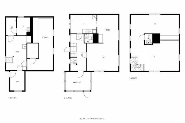 - Pinta-alat perustuvat myyjältä saatuihin tietoihin ja rakennuspiirustuksista laskettuihin arvioihin. Pinta-aloja ei ole tarkistusmitattu, mitattaessa pinta-alat saattavat olla ilmoitettua suurempia tai pienempiä. Kohteen kauppahinta ei ole osaksikaan pinta-alaperusteinen vaan perustuu kokonaisuuteen. Asuintilojen pinta-ala on laskettu rakennuspiirustuksista ja siihen on huomioitu kaikki asuinkäytössä olevat tilat, muihin tiloihin on laskettu varastotilat ja kuisti.