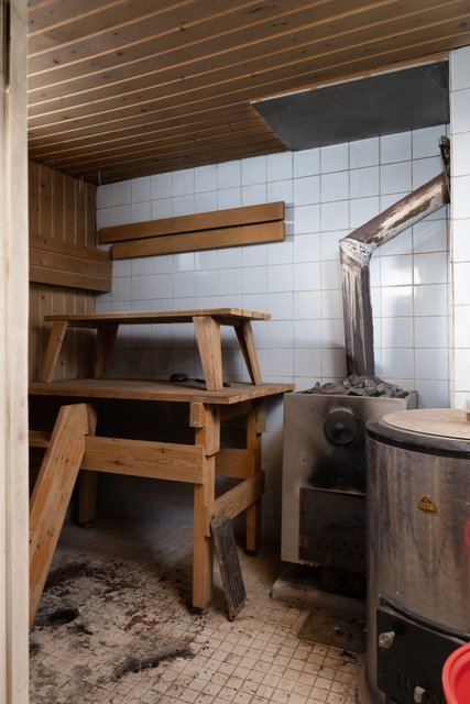 - Saunassa on iäkkäät pinnat ja vaatii remonttia. Varustus: puukiuas, vesipata ja kiinteät valaisimet. Lattiapinnat laattaa, seinäpinnat laatoitettu osin paneelia.