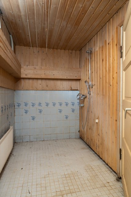 - Kylpyhuoneessa iäkkäät ja huonokuntoiset pinnat. Varustus: suihku ja kiinteä valaisin. Lattiapinnat laattaa, seinäpinnat laattaa osin paneelia.