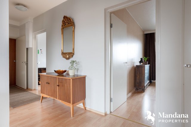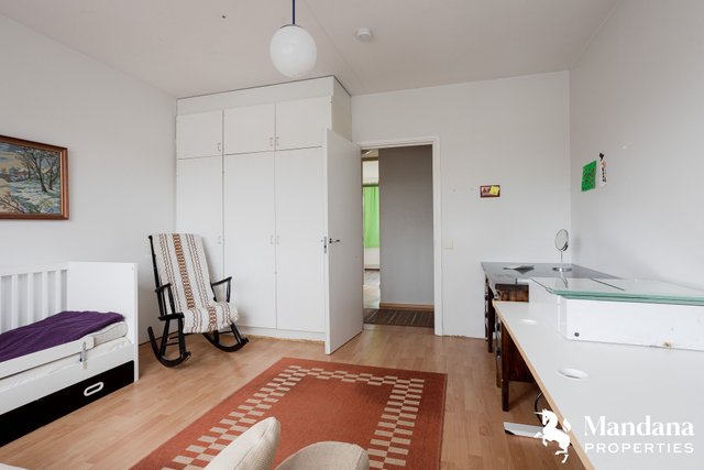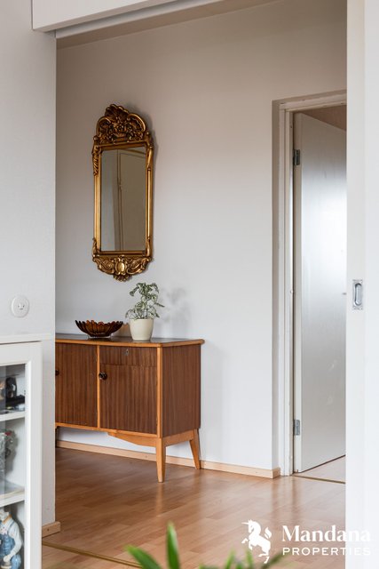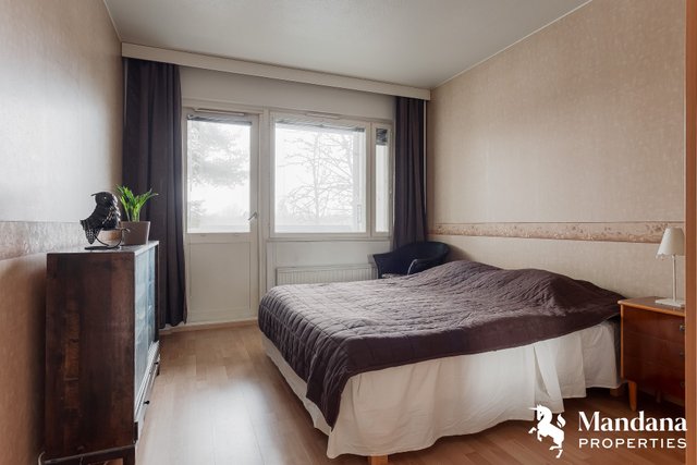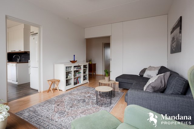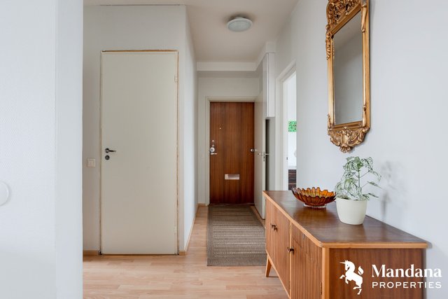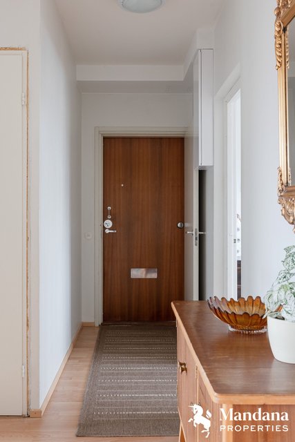 Valoisa läpitalon huoneisto. Aikakauden rakentamiselle tyypillisesti tilavat makuuhuoneet, joista toisesta käynti etelään avautuvalle lasitetulle parvekkeelle. Keittiö on remontoitu 2012. Säilytystilaa löytyy niin vaatehuoneesta kuin kaapistoista. Avarassa eteisaulassa on tilaa myös lisäkaapistolle.