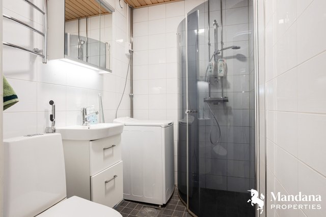 - VARUSTUS: WC-istuin, bidee-suihku, suihku, suihkukaappi, peilikaappi, pesuallas, allaskaappi vetolaatikoilla, pyyhkeenkuivausteline, pesukoneliitäntä SEINÄT: kaakeli LATTIA: laatta