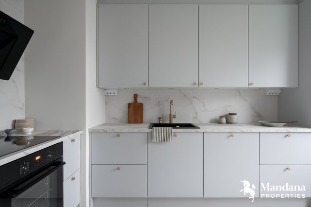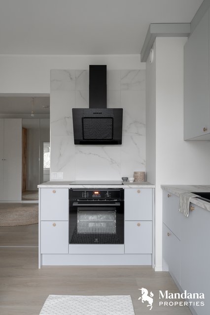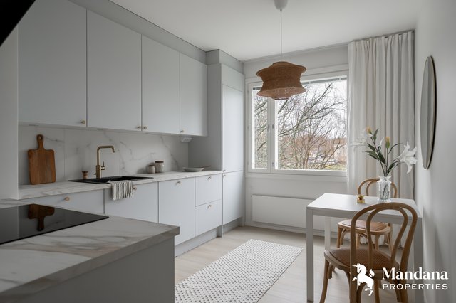 - VARUSTUS: Integroitu jääkaappipakastin, induktioliesi, kiertoilmauuni, liesituuletin (aktiivihiilisuodattimella), integroitu astianpesukone, varaus yläkaapin sisällä mikroaaltouunille, Damixan Silhouet keittiöhana, Blancon allas, LED-valaisimet yläkaappien alla, 3-osainen jätteenlajittelujärjestelmä, kaapistot ja vetolaatikostot hidastimilla. VÄLITILA: Laatta. TASOT: Laminaattitaso. SEINÄT: Maali. LATTIA: Vinyylilankku.