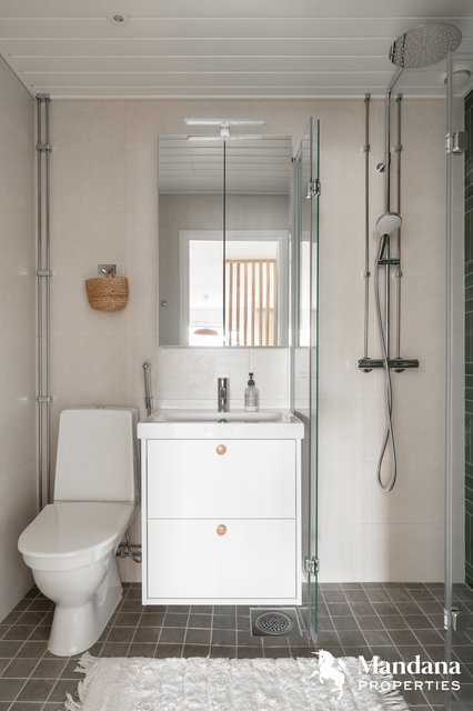 - Vesieristyksineen uusittu kylpyhuone 11/2025. VARUSTUS: Sadesuihku, taittuvat suihkuseinät, WC-istuin, Damixan Silhouet hana käsisuihkulla (bidee,), allas- ja peilikaappi valolla, pesukoneliitäntä, pyyhekuivain. SEINÄT/LATTIA: Laatta.
