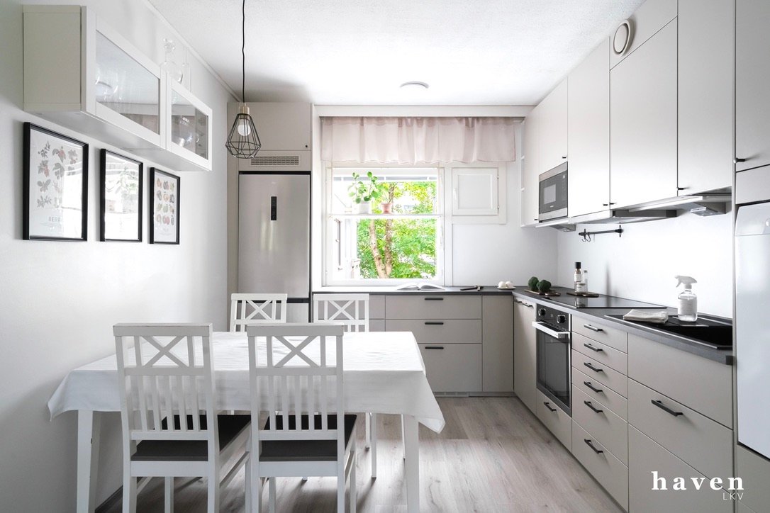 - Jääkaappi/pakastin, induktiokeittotaso, erillisuuni (kiertoilma, pyrolyysi), mikroaaltouuni grillitoiminnolla, liesituuletin (aktiivihiili), astianpesukone. Paljon kaappi- ja laskutilaa. Kaunis hiekansävyinen keittiö, remontoitu 2024.