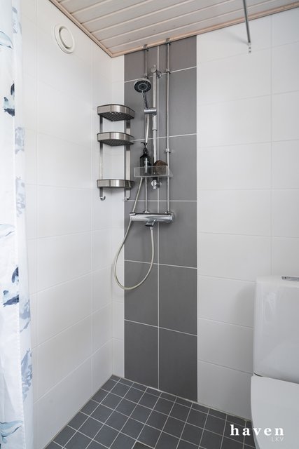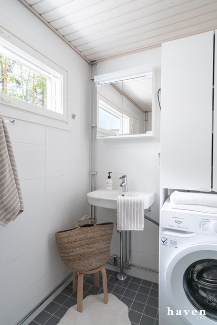 - Ikkunallinen laatoitettu kylpyhuone lattialämmityksellä. Peilikaappi, wc-istuin, pesukoneliitäntä.