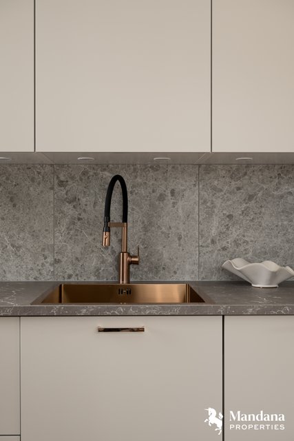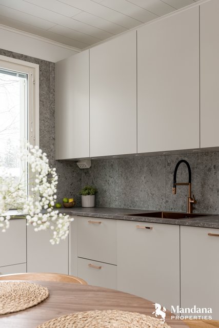 - Olohuoneen kanssa yhdistyvä avokeittiö, jossa on runsaasti lasku- sekä säilytystilaa. Vetolaatikostot ja kaapistot hidastimilla, kulmakaapissa LeMans säilytysmekanismi ja kodinkoneet on integroidu kaappien sisälle. VARUSTUS: Jääkaappipakastin, astianpesukone, erillisuuni, induktioliesi, liesituuletin (puhaltaa ulos), pesuallas, hana taipuvalla ja irroitettavalla juoksuputkella, kaapistot, kiinteät LED-valaisimet yläkaappien pohjassa, sälekaihtimet ikkunoissa. SEINÄT: Maali/laatta. VÄLITILA: Iso 60x60 laatta. TYÖTASOT: Laminaatti. LATTIA: Vinyyli.