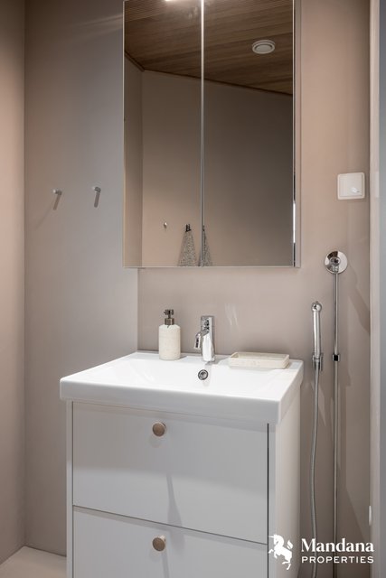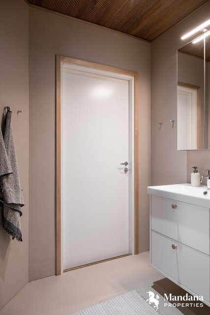 - Pintapuolisesti remontoidussa isossa kylpyhuoneessa harmoniseen sävymaailmaan lämpöä tuo katon koristeellinen puupanelointi. Vesivaraaja ja paikka pyykinpesukoneelle löytyy liukuovilla olevan kaapiston sisältä. VARUSTUS: Sadesuihku, suihkuseinä, wc-istuin, peilikaappi valaisimella, pesuallas, allaskaluste, hana, bidee-suihku, pyyhekoukut, kiinteä LED-valaistus, lattialämmitys, pesukoneliitäntä, vesivarajaa, ilmanvaihtokone. SEINÄT/LATTIA: Laatoitus Basebeton-pinnoitteella.