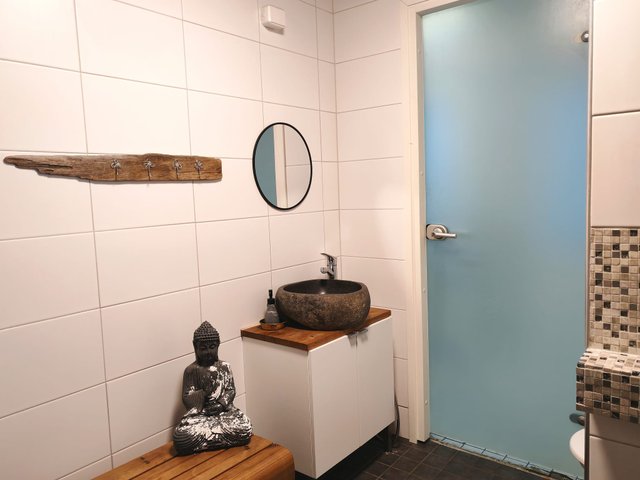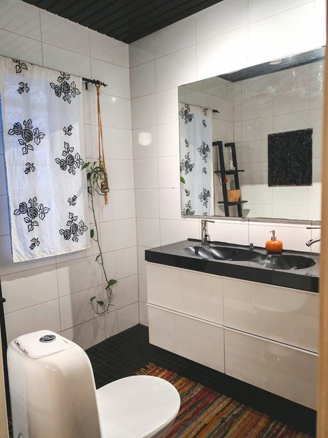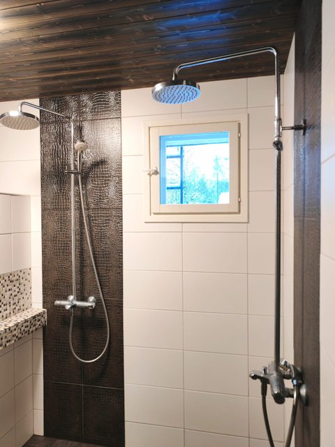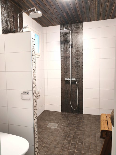 - WC-istuin, suihku (Kaksi suihkua), lattialämmitys, peili, pesuallas, allaskaappi, ja bidee-suihku