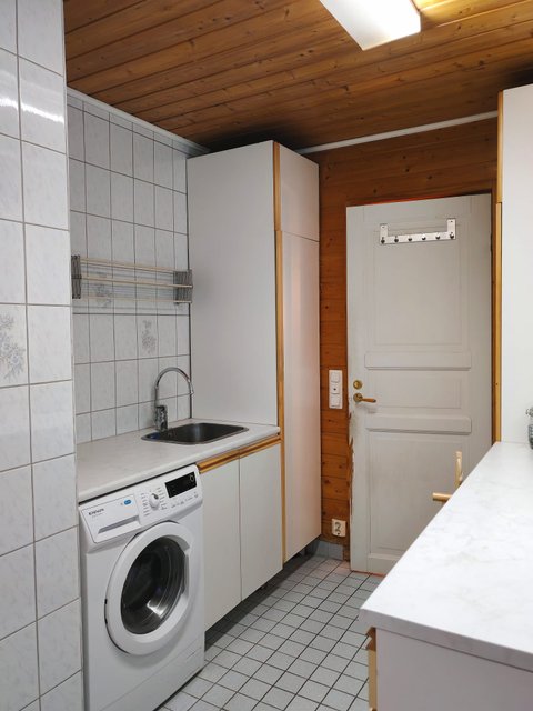 - Pesukoneliitäntä, pesuallas, lattialämmitys, lattiakaivo, lastenhoitopöytä/taso, pyykkikaapit, ja pöytätaso