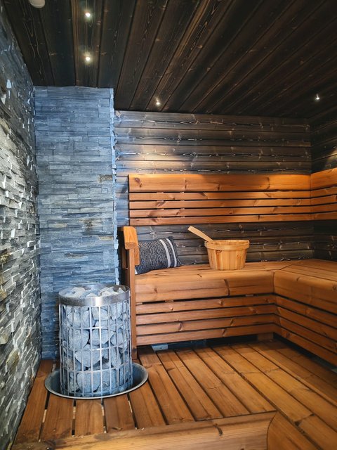 Olohuoneessa on tunnelmallinen takka, joka luo lämpöä ja kodikkuutta kylminä talvi-iltoina. Keittiö on varusteltu kivitasoilla. Kylpyhuoneessa on kaksi suihkua ja mukavuutta lisäävä lattialämmitys, ja upea sauna tarjoaa rentouttavat löylyt pitkän päivän päätteeksi.
