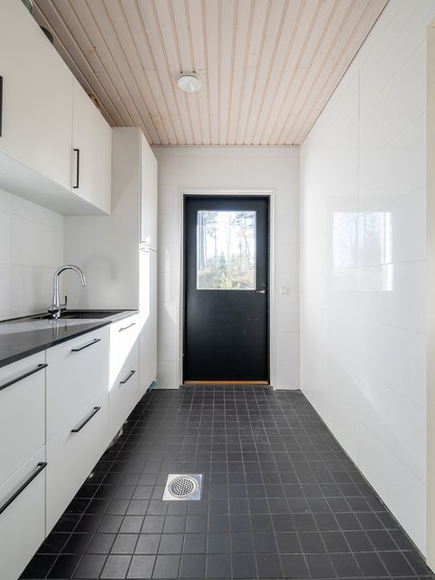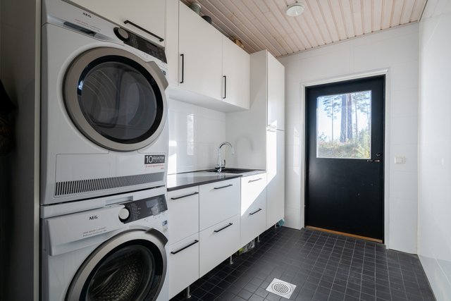 - Pesukone, kuivausrumpu, pesukoneliitäntä, lattialämmitys, pesuallas, lattiakaivo, tila pesutornille, ja pyyhekuivain / seinäpatteri