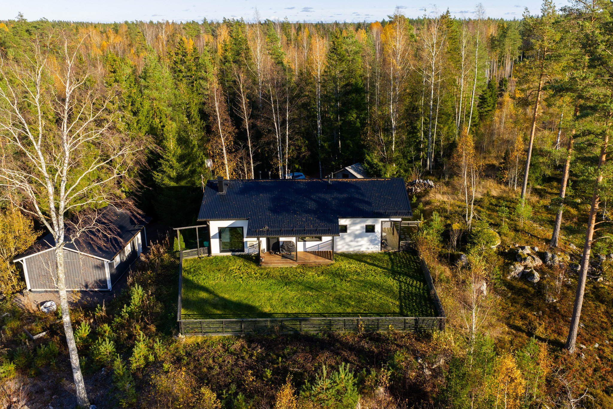 Takapihan aidattu nurmialue tarjoaa turvallisen leikkipaikan lapsille tai lemmikeille. Katettu terassi on täydellinen paikka nauttia aamukahvista tai illallisesta ulkona. Talo on rakennettu kallion päälle, mistä upeat maisemat joka suuntaan.