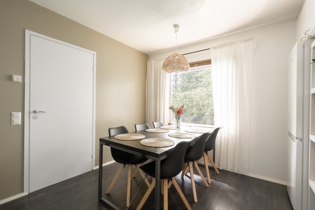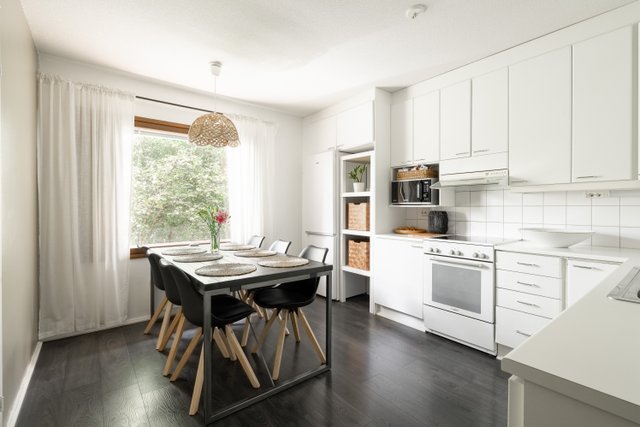 Tämä valoisa ja käytännöllinen paritalokoti Perniön Kirkonmäellä tarjoaa sujuvaa arkea ja viihtyisää asumista. Keittiön ajattomat valkoiset kaapistot tekevät ruoanlaitosta miellyttävää, ja erillinen wc lisää arjen toimivuutta.