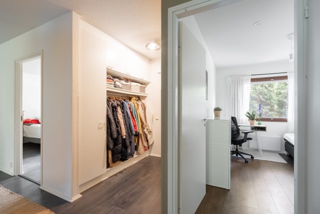 Tilava eteinen ja tuulikaappi antavat runsaasti säilytystilaa, ja molemmissa makuuhuoneissa on myös omat kaapistot. Asuntoon kuuluu myös paljon lisää säilytystilaan antavat autotalli ja varasto, jotka on sijoitettu käytännöllisesti asuntojen väliin, jolloin naapurista ei ääniä kantaudu.